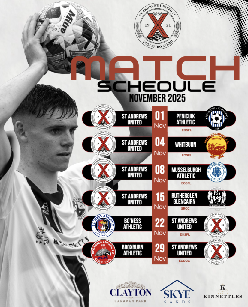 To finish the month, Saints hit the road — travelling to Bo’ness Athletic in the Premier Division on Saturday 22nd November and then to Broxburn Athletic for the East of Scotland Qualifying Cup Fourth Round on Saturday 29th November