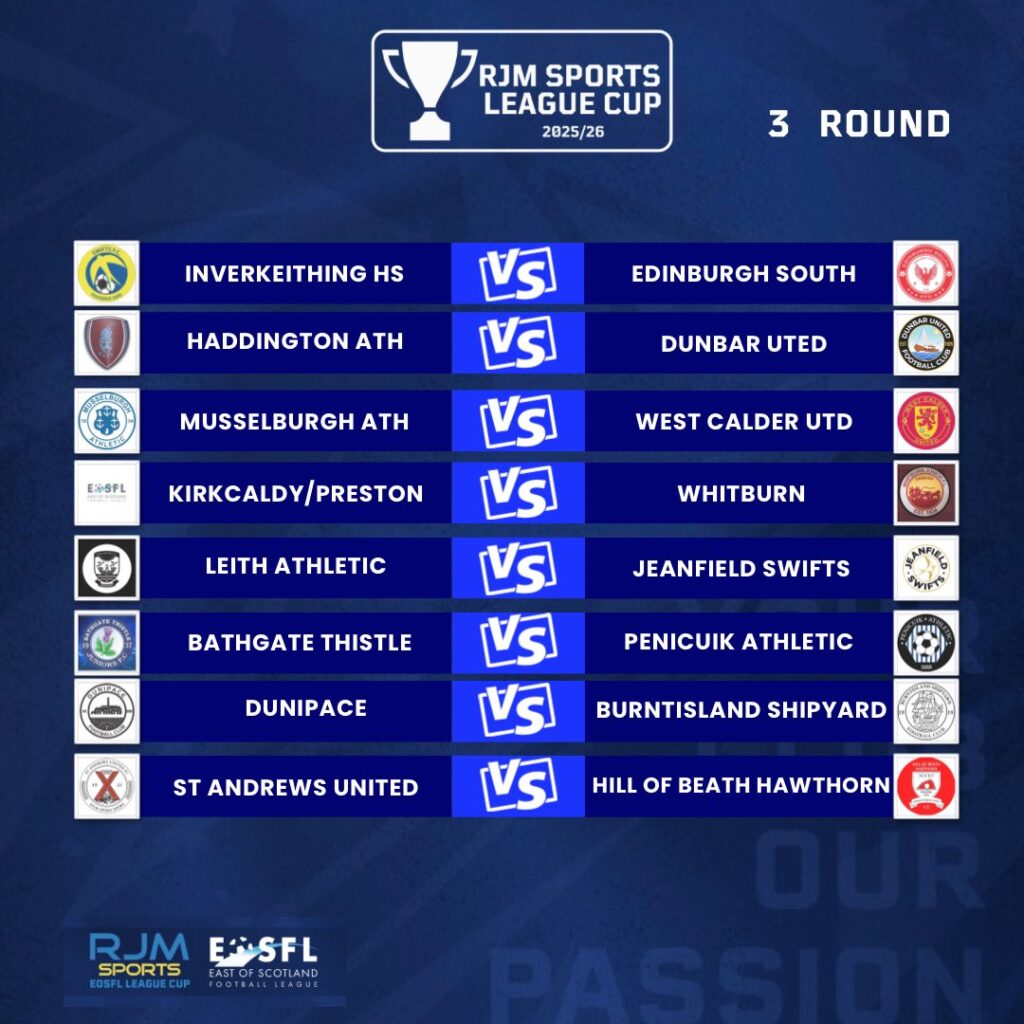 St Andrews United have been handed a mouthwatering Fife derby in the last 16 of the RJM Sports League Cup, as we welcome Hill of Beath Hawthorn to the Clayton Caravan Park Recreation Ground on Saturday 18th April.