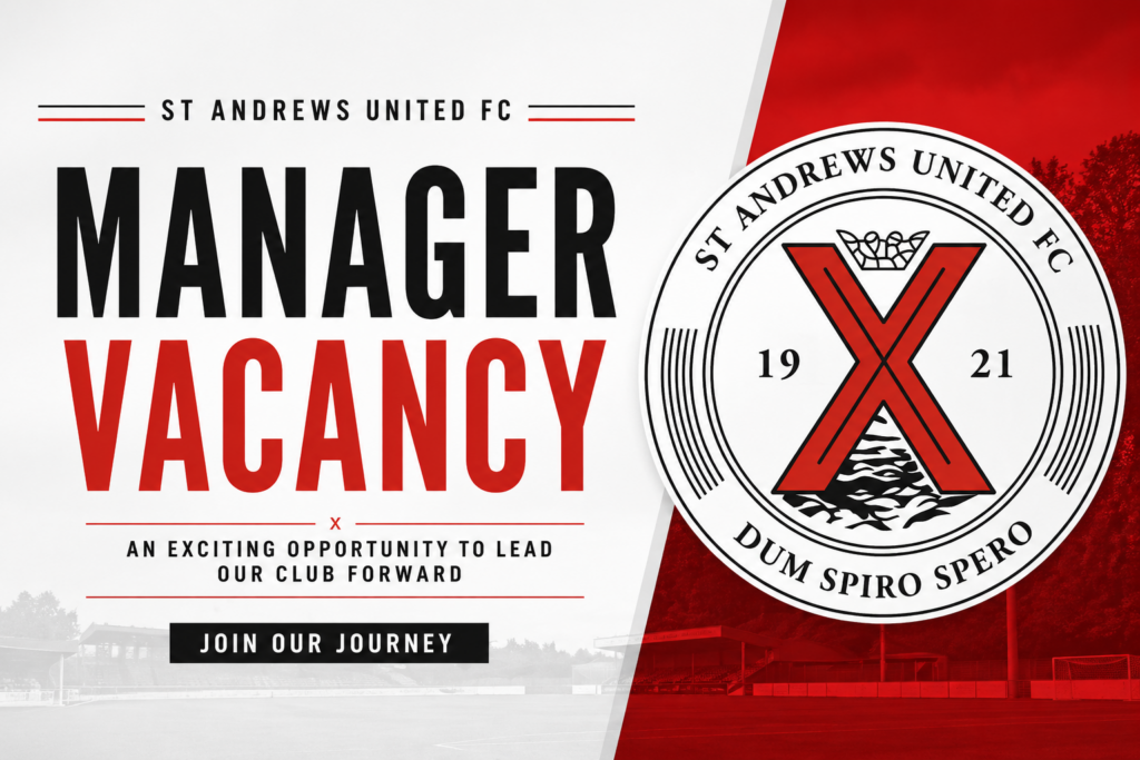 We also echo Greg’s own recognition of his backroom staff, whom he credited for their “hard work, loyalty and professionalism” and as being “a huge part of everything we’ve achieved.” Stuart Milne and Stevie Clark have made a significant contribution during their time at the club, and we thank them both for their dedication and service. Greg also expressed his appreciation to everyone connected with St Andrews United for their “trust, commitment and passion” during his time at the club. Those sentiments are warmly reciprocated by all at St Andrews Utd.