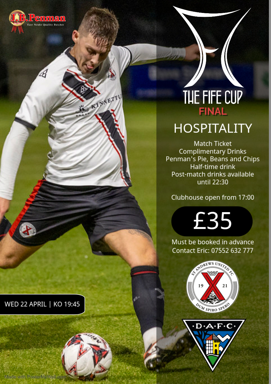 Book Now – Join us for the big one, St Andrews United take on Dunfermline Athletic in the Fife Cup Final on Wednesday 22nd April (KO 19:45)! Make a night of it with our fantastic hospitality package, including match ticket, complimentary drinks, and of course some top-tier scran thanks to our brilliant match and pie sponsors, J.B. Penman (because a final without a proper pie just isn’t right!). Must be booked in advance by contacting Eric: 07552 632 777