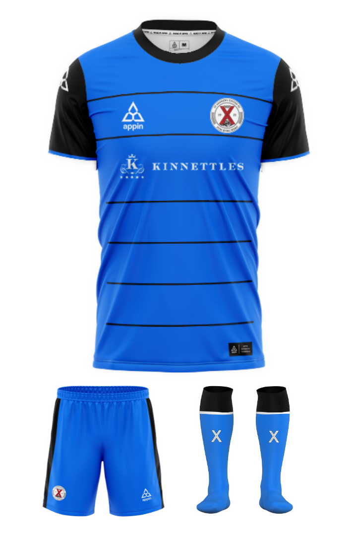 Blue Shirts with Black Sleeves/Blue Shorts/Blue Socks.